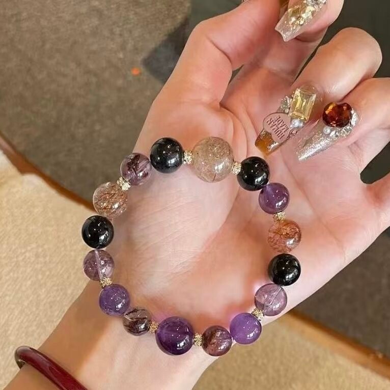 Introduction: The “Super Wisdom” bracelet. Purple Rutilated Quartz combines spiritual power and energy amplification. Black Tourmaline purifies the surrounding aura. Super Seven gathers diverse energies. Together, they enlighten wisdom, help you perceive opportunities in advance, calm the mind, and start a new journey of wisdom.
